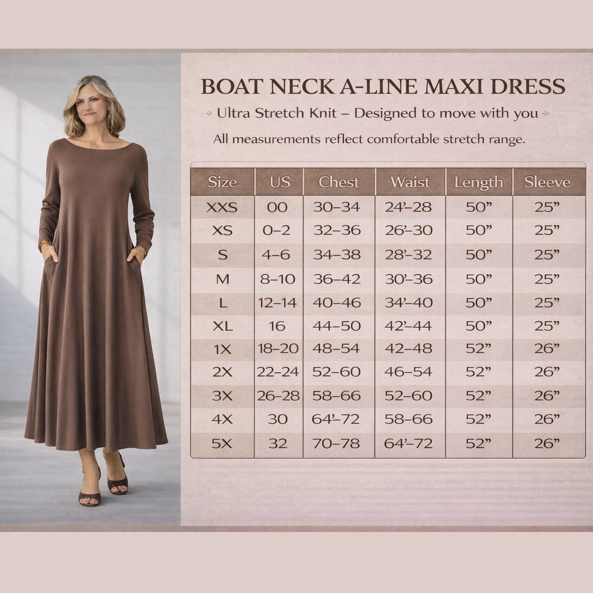 This boat neck long sleeve maxi dress with pockets is made from our signature double brushed rib knit β buttery soft, lightweight, and designed with 4-way stretch for beautiful movement and comfort.